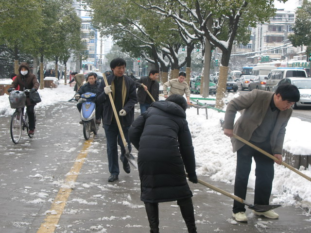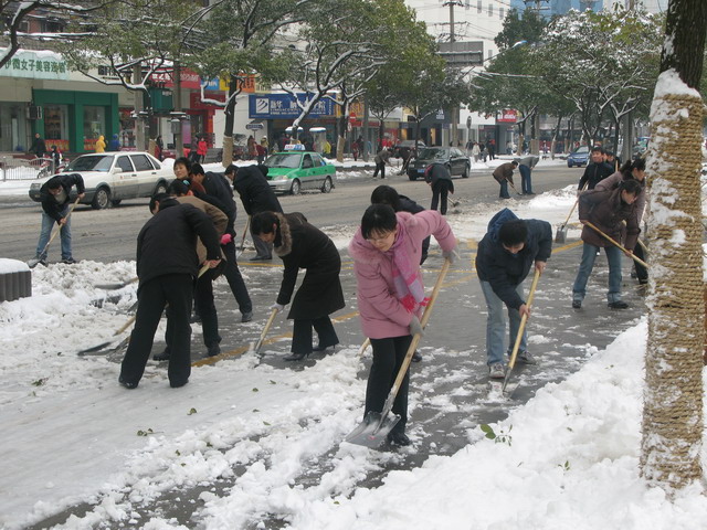 公司全体员工不顾天寒地冻,热火朝天的在街头挥锹铲雪,迅速清除了公司院内、门前及荣事达大道市府广场至寿春路段交通主干道的路面积雪,保证了公司出入车辆及门前交通干道的行车安全,受到市民的赞许。
